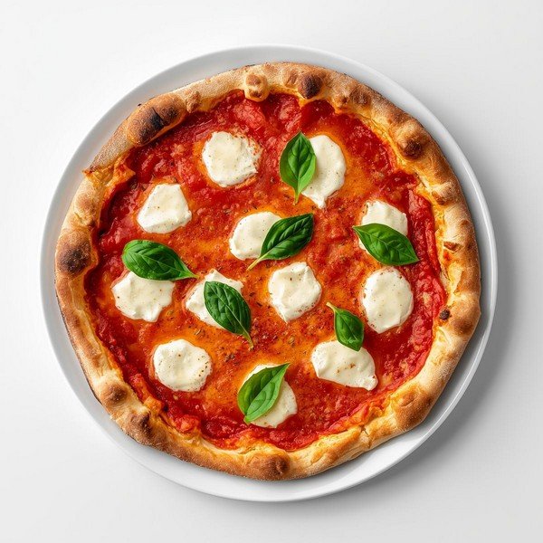 Eine klassische italienische Pizza, belegt mit fruchtiger Tomatensauce, zartem Mozzarella und frischem Basilikum – purer Genuss für alle, die es einfach und authentisch lieben.